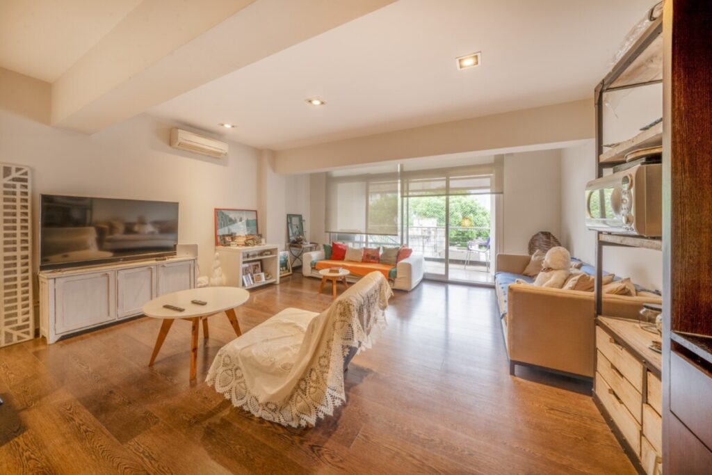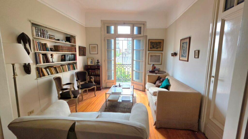 85 m2 ‧ 2 dorm.Buen departamento en edificio antiguo. Frente luminoso. Palier semi privado. Hall de entrada con chimenea. Living a balcón al frente y comedor. 2 dormitorios (principal al frente). 1 baño completo. Cocina y comedor diario. 2 balcones franceses. Techos altos. Pisos de pinotea. Apto profesional.