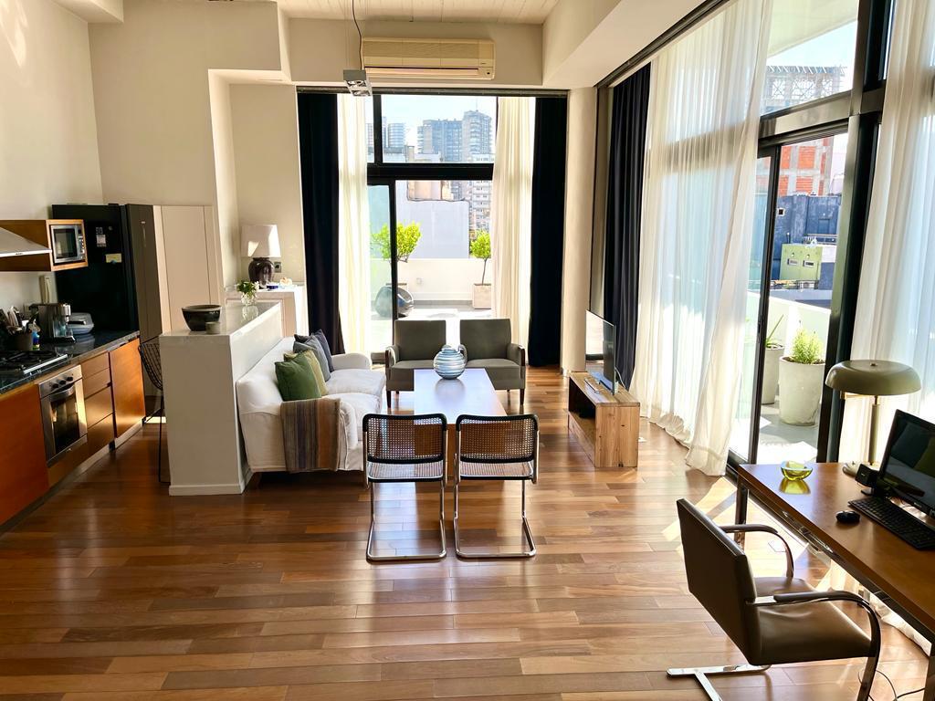 158 m2 ‧ 2 dorm. ‧ 1 cocheraIncreíble pent house. Todo luz! Hall. Living comedor con techos de 4 mts. de altura a terraza. Pisos Patagonia. Cocina incorporada. 2 dormitorios (principal con vestidor). 1 baño completo con hidro. 1 cochera fija. Persianas metálicas eléctricas. Vigilancia 24 horas. Amenities.