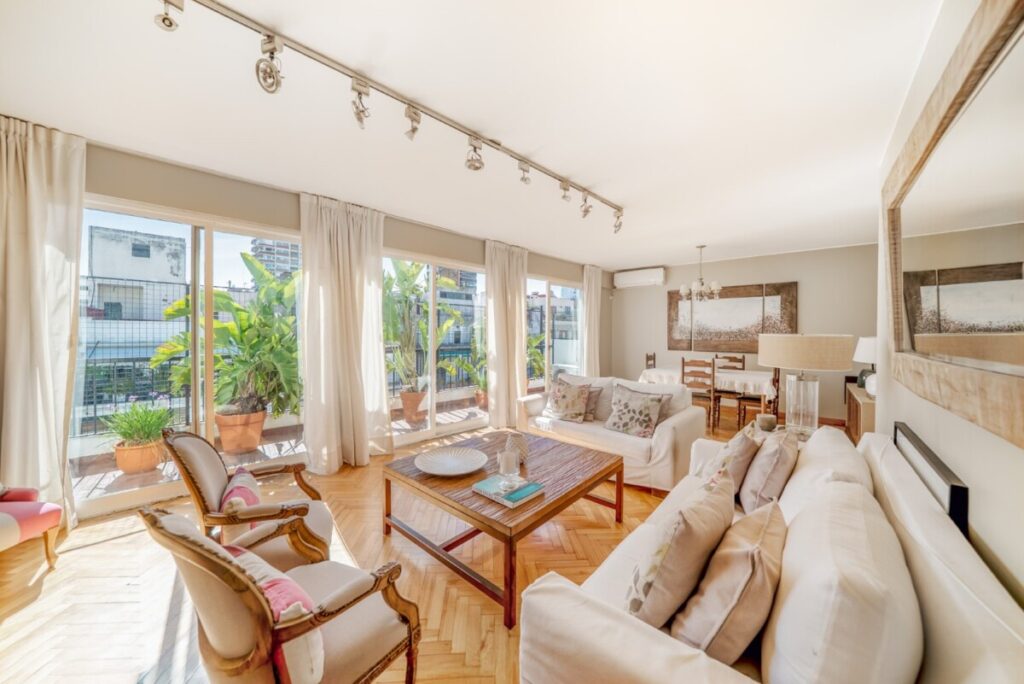 181 m2 ‧ 3 dorm. ‧ 1 cocheraMuy buen duplex al frente. Super luminoso. Piso 9°: Palier privado. Hall. Living comedor a balcón. Pisos de parquet. Toilette. 1 dormitorio en suite. Cocina con comedor diario. Lavadero. Dependencia. Piso 10°: 2 dormitorios a balcón. Escritorio. 2 baños. Baulera. 1 cochera fija.